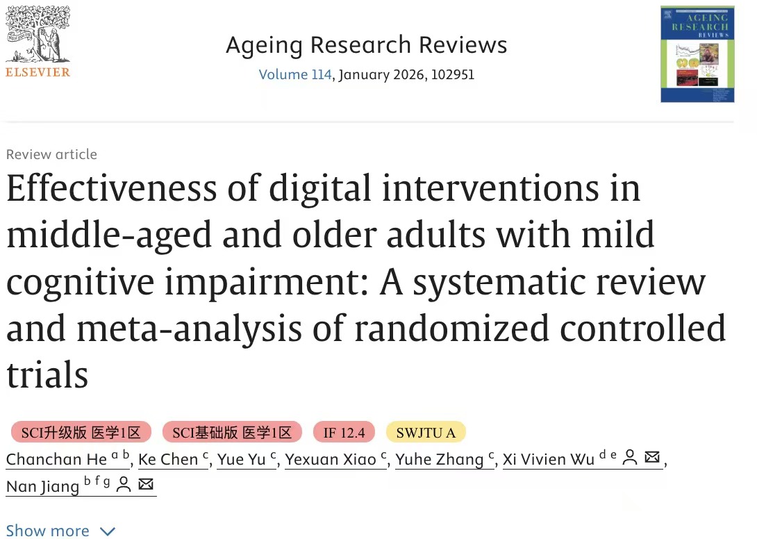 文章信息:Chanchan He, Ke Chen, Yue Yu, Yexuan Xiao, Yuhe Zhang, Xi Vivien Wu, Nan Jiang. Effectiveness of digital interventions in middle-aged and older adults with mild cognitive impairment: A systematic review and meta-analysis of randomized controlled trials. Ageing Research Reviews. 2026;114:102951. https://doi.org/10.1016/j.arr.2025.102951